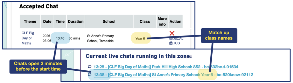 At times, there may be lots of Chats running. Check the school and class of the Chat on your Dashboard before you start. That way, you know which one you are looking to join when you get to the Chat page. Make sure you join the correct one – with the class who’ve prepared to chat with you.
